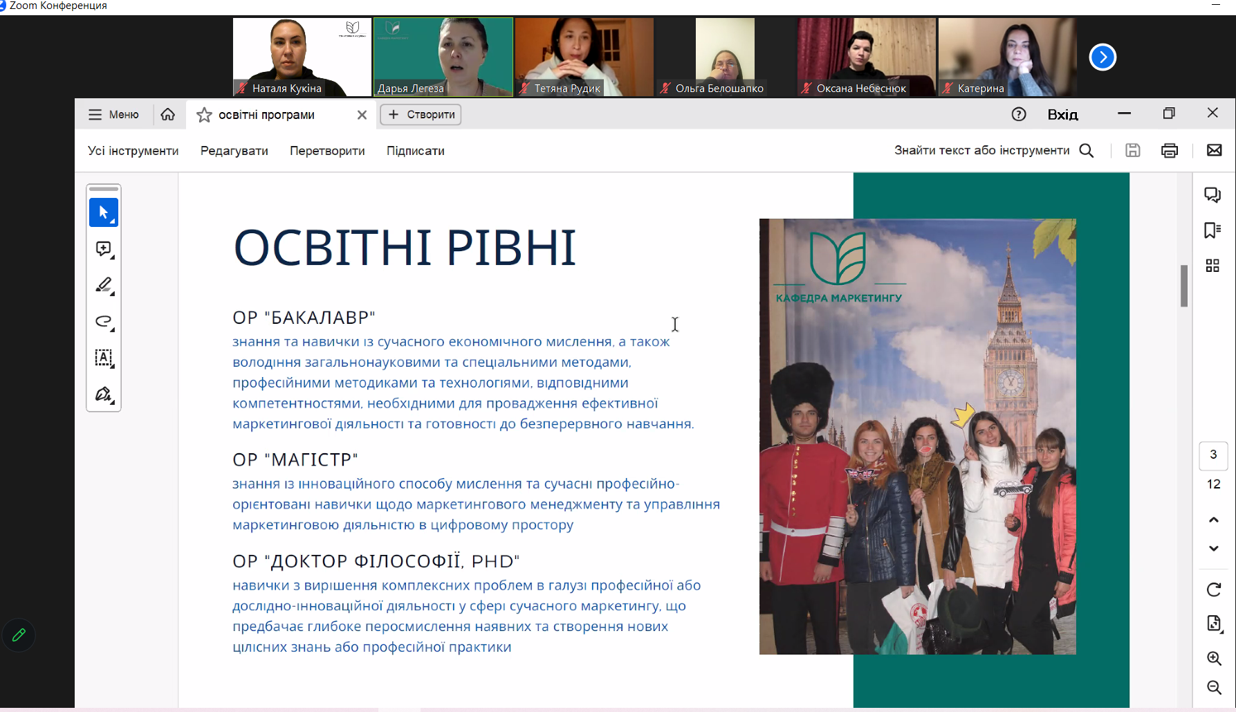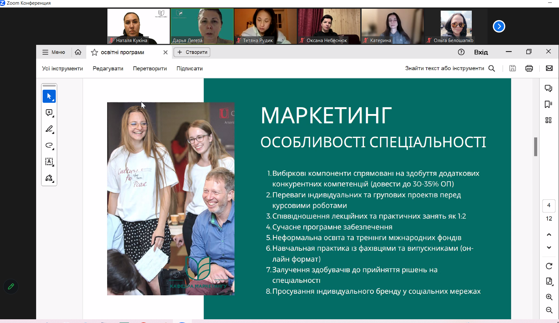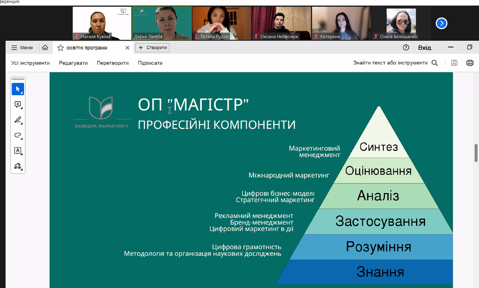 Дар’я Георгіївна ЛЕГЕЗА, як гарант освітньої програми «Маркетинг» другого (магістерського) ступеня освіти ознайомила здобувачів освіти з Освітньою програмою. Було детально сконцентровано увагу на комплекс освітніх компонентів (предметів вивчення, дисциплін, індивідуальних завдань, контрольних заходів тощо), спланованих і організованих для досягнення визначених результатів навчання. Також зроблено акцент на можливостях міжнародної практики, стажування, а також спілкування з провідними фахівцями світу в галузі маркетингу.
