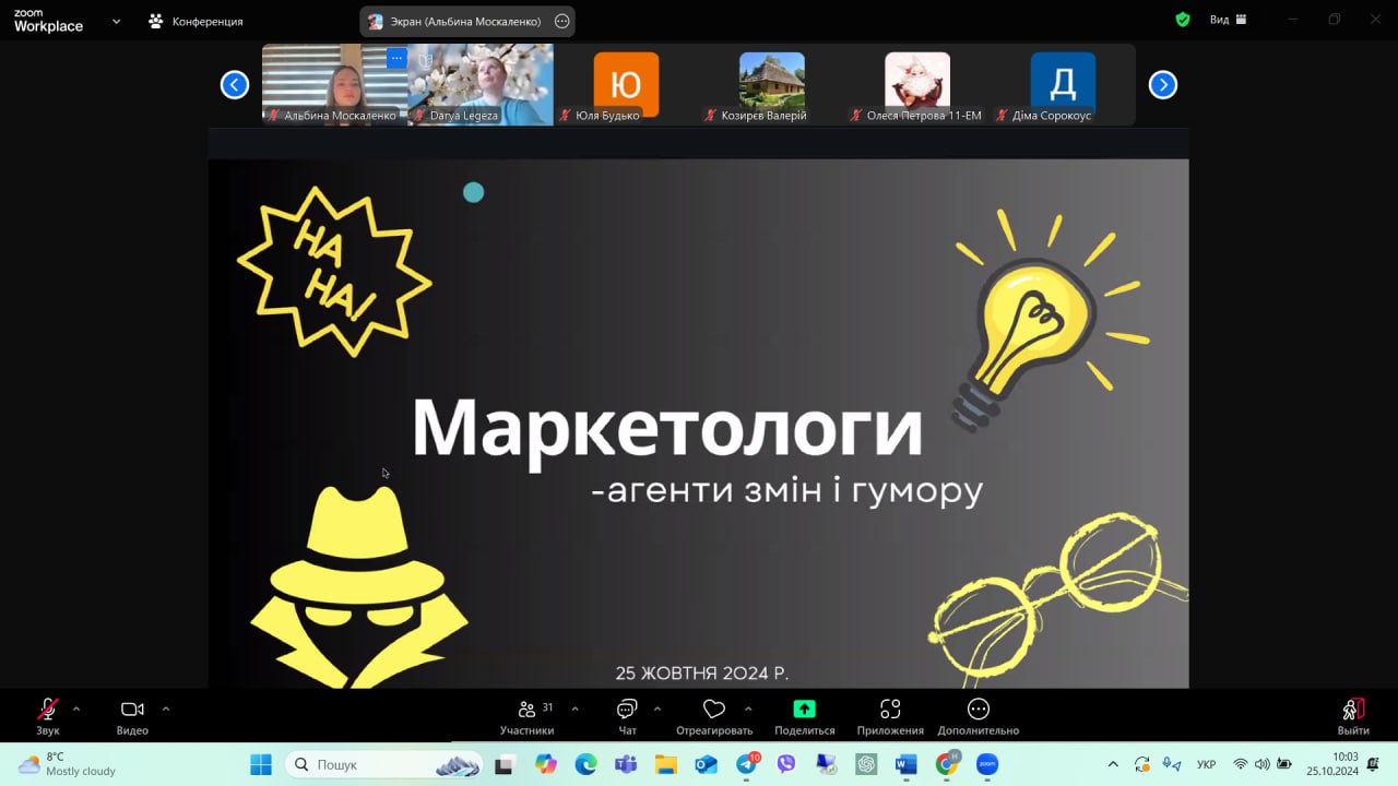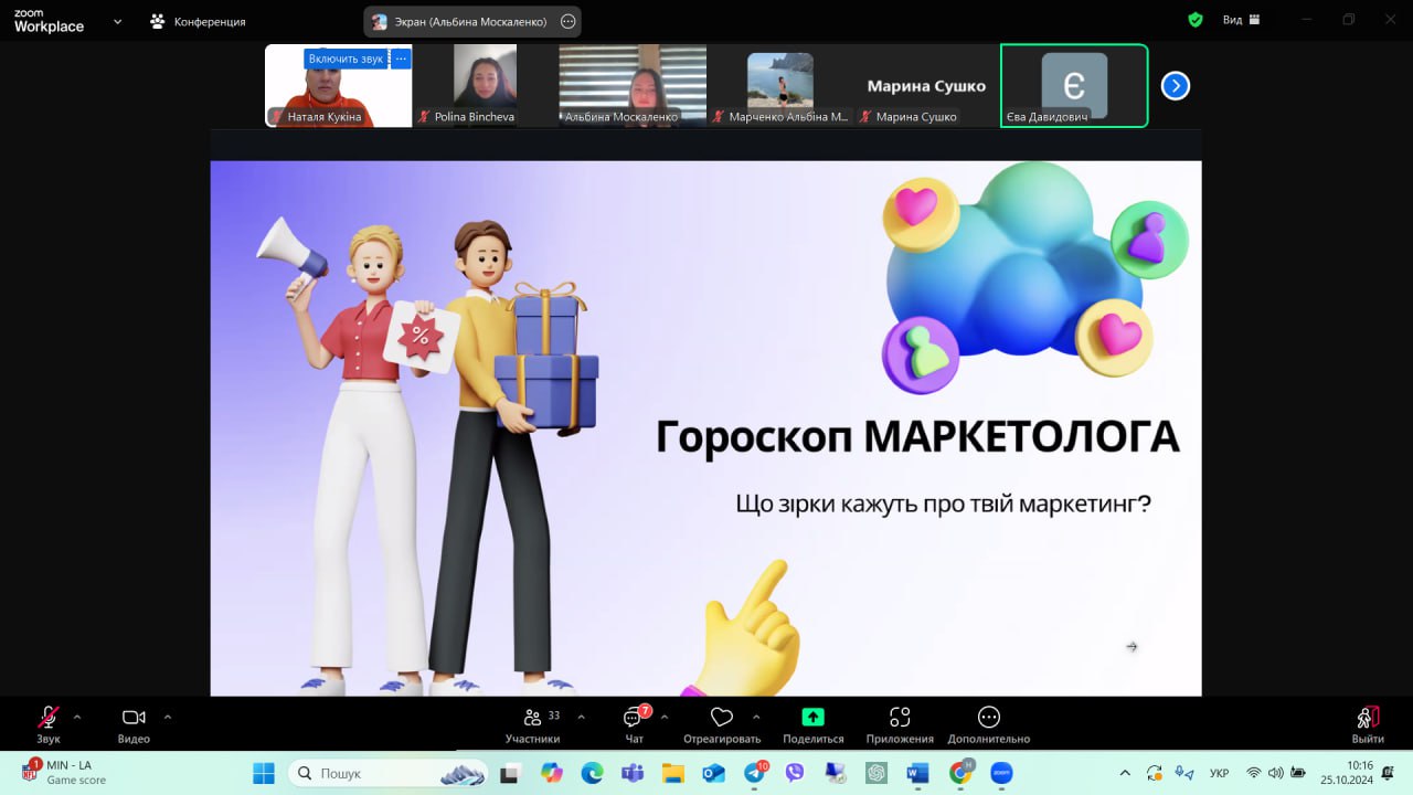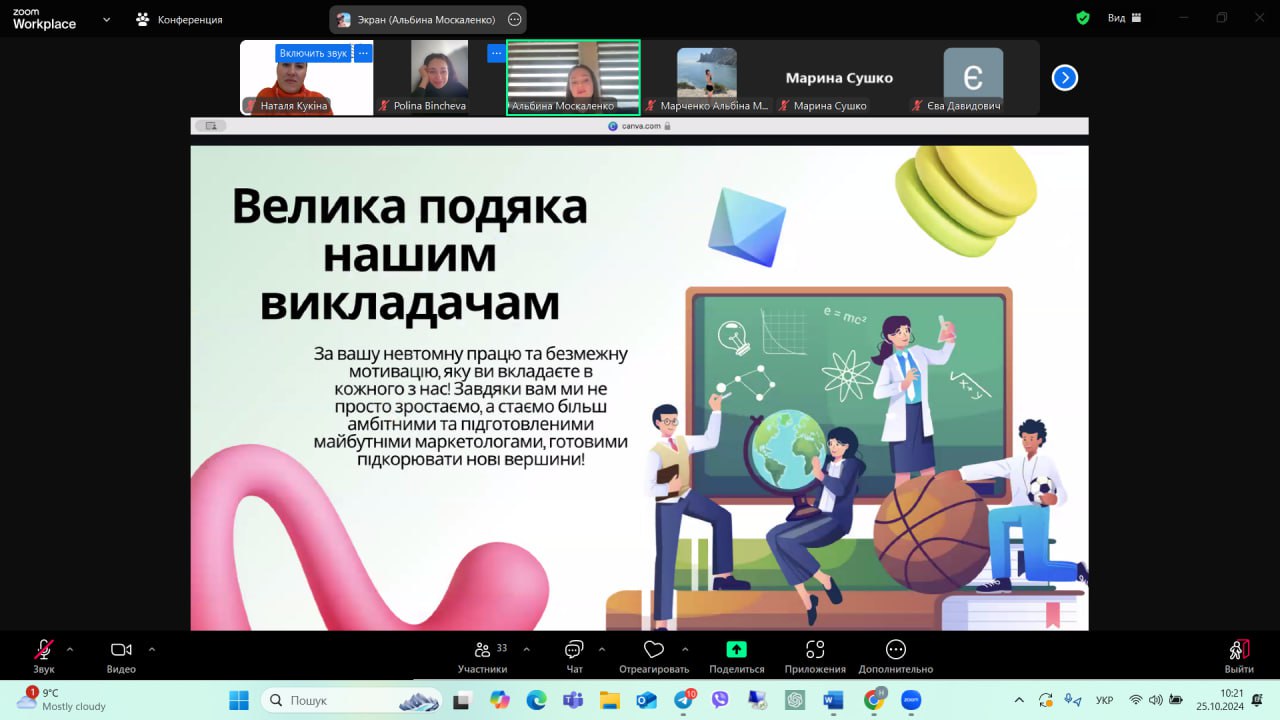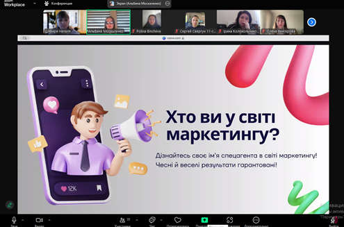 25 жовтня 2024 року здобувачі вищої освіти 31МК та 21с(ФМБ)МК груп спеціальності «Маркетинг» організували онлайн-захід, щоб гідно відсвяткувати професійне свято – ДЕНЬ МАРКЕТОЛОГА. Це особливе свято стало справжньою подією, сповненою яскравих конкурсів, інтерактивних вікторин та теплих привітань.