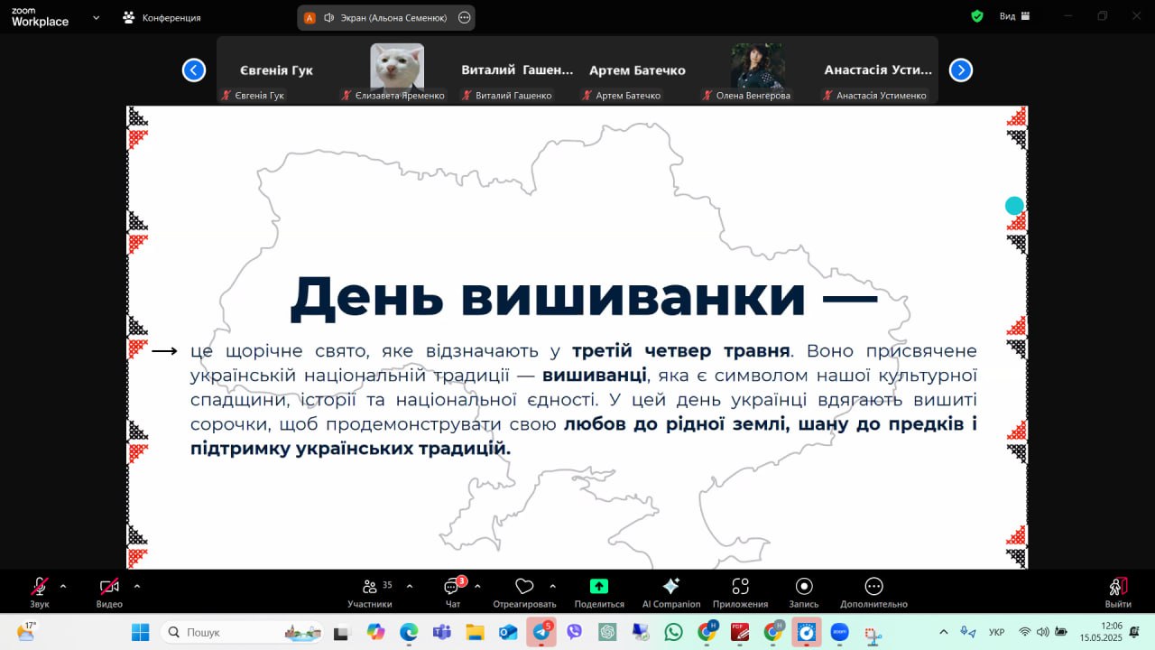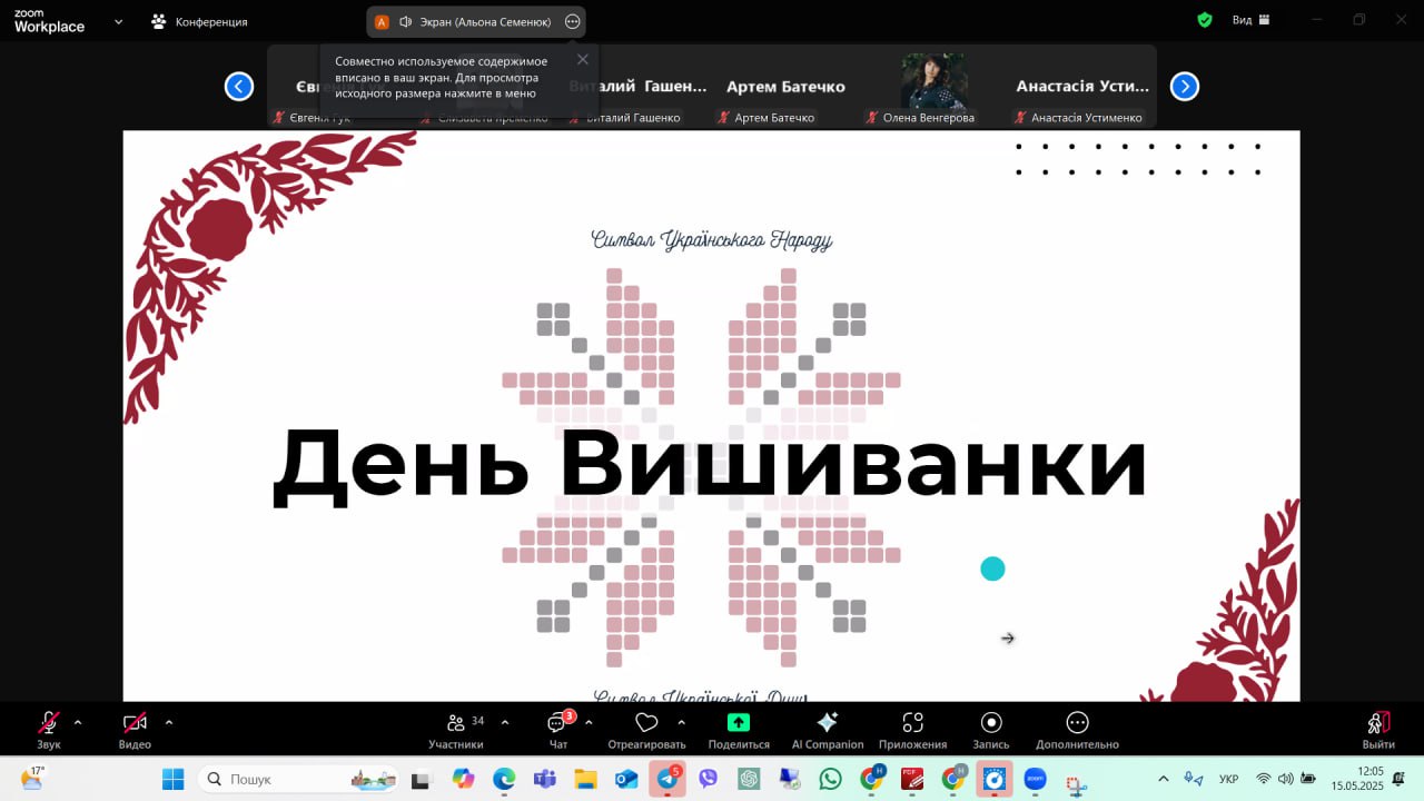 Святкування розпочалося з презентації, яка ознайомила присутніх з історією вишиванки як елементу нематеріальної культурної спадщини. Було розкрито значення різноманітних візерунків, кольорової гами та регіональних особливостей вишивки, зокрема зосереджено увагу на символіці, закладеній у традиційному орнаменті.