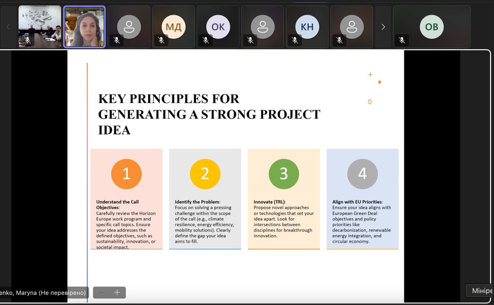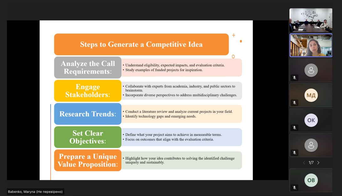 • Генерація ідеї проєкту, яку висвітлила Марина Бабенко, кандидат технічних наук, доцент, керівник центру міжнародного наукового співробітництва.