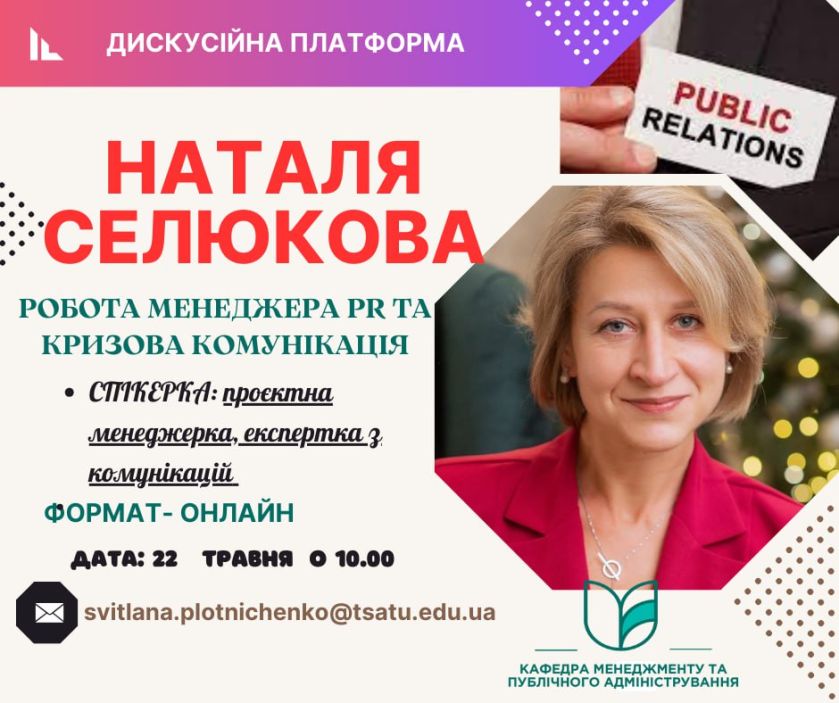 22 травня здобувачі вищої освіти спеціальності «Маркетинг» Таврійського державного агротехнологічного університету імені Дмитра Моторного долучилися до онлайн-лекції на тему «Робота менеджера PR та кризова комунікація», яку провела експертка з комунікацій Наталя Селюкова. Захід організувала кафедра менеджменту та публічного адміністрування в межах дискусійної платформи, що традиційно об’єднує здобувачів та практиків задля обміну досвідом і знаннями.