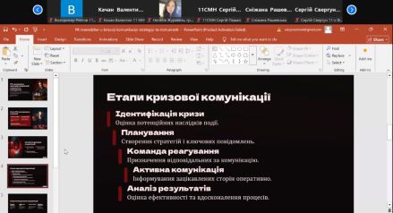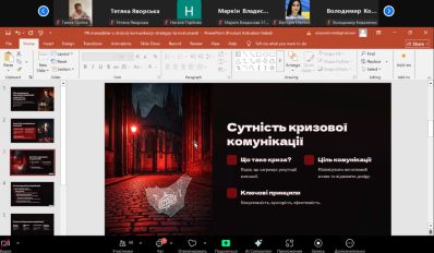 Упродовж лекції слухачі мали змогу дізнатися, яким чином PR-менеджери мінімізують репутаційні ризики компаній, як будуються ефективні стратегії комунікації у період кризи, а також які інструменти дають змогу досягати результату швидко та з урахуванням суспільних очікувань. Спікерка детально розповіла про роль комунікацій у формуванні бренду, взаємодії зі ЗМІ та підтримці репутації в кризових обставинах. Особливий акцент було зроблено на важливості прозорості, оперативності та чіткості дій у складних ситуаціях, коли довіра до бренду перебуває під загрозою.