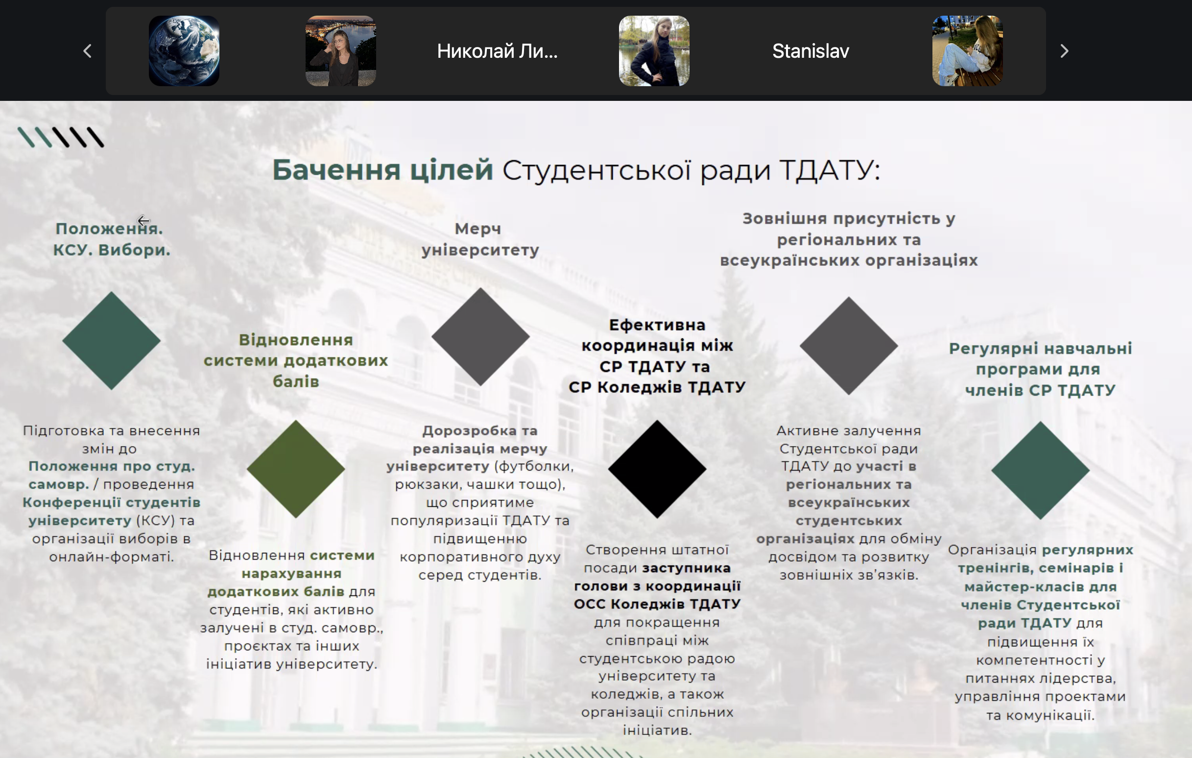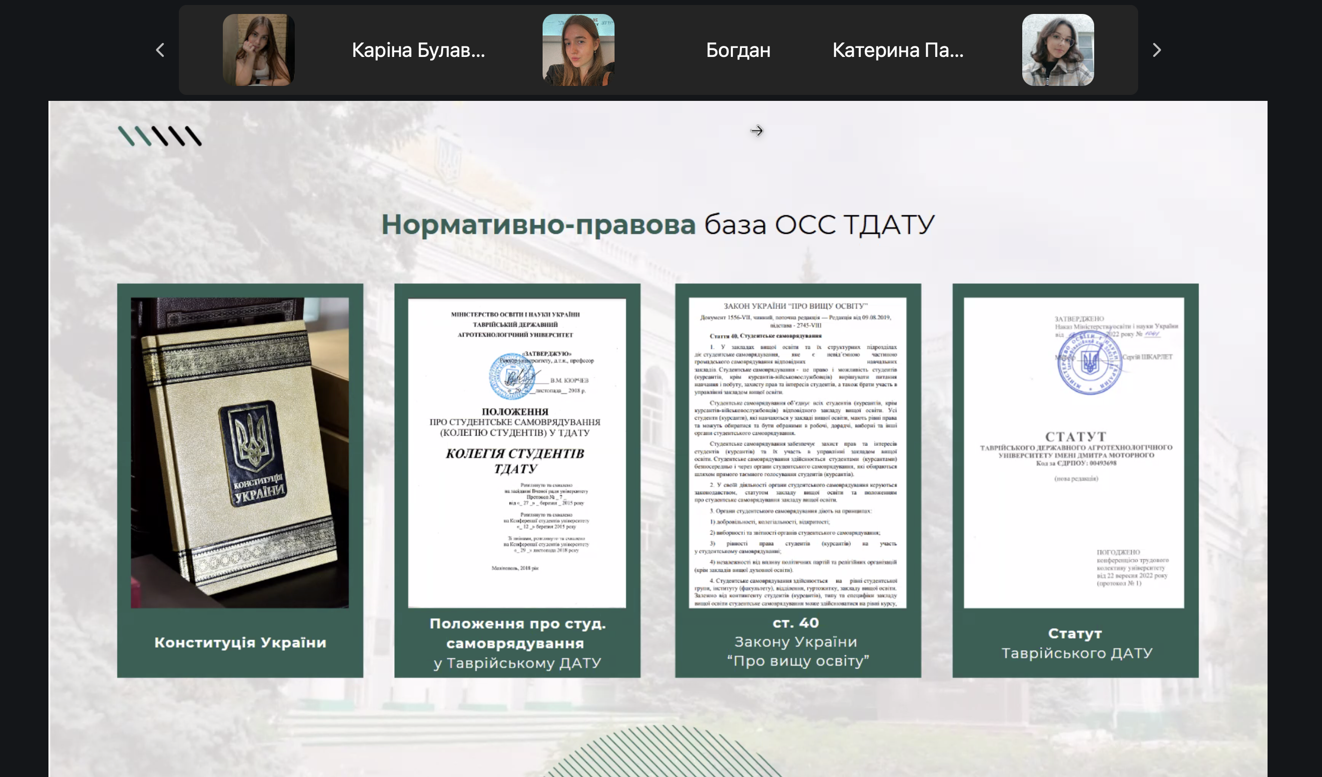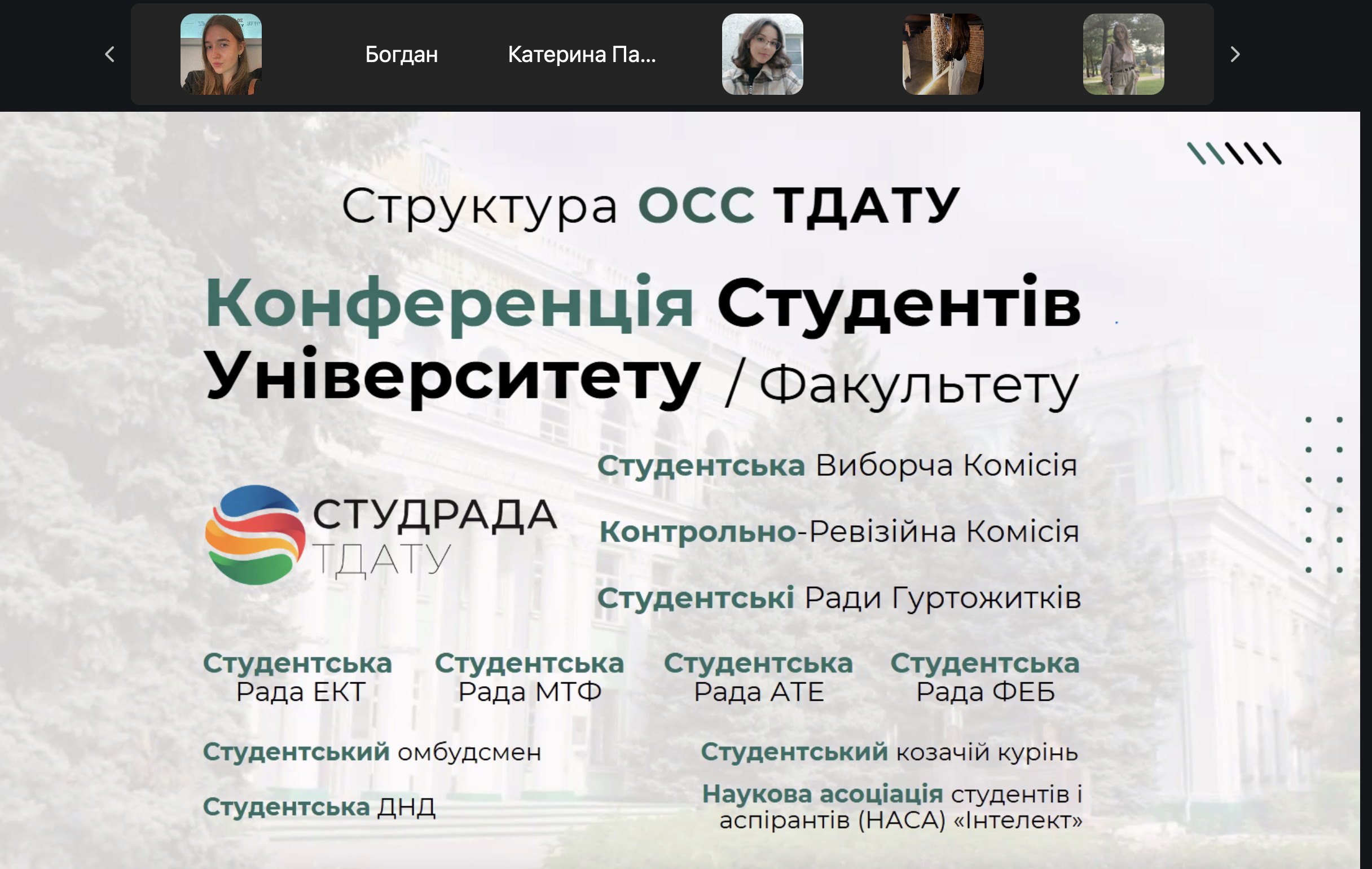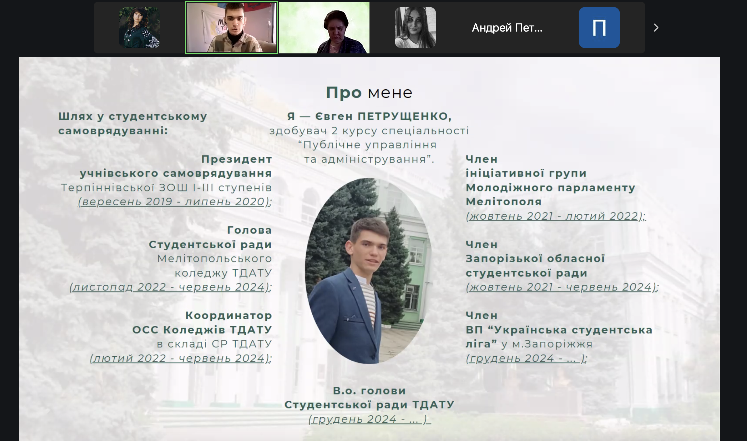 Під час заходу студенти дізналися про структуру органів студентського самоврядування, ключові напрями їх діяльності та познайомилися з головою студентської ради – Євгеном Петрушенком. Його багатий досвід у студентському самоврядуванні вразив присутніх, адже він обіймав такі посади, як президент учнівського самоврядування та координатор ОСС Коледжів ТДАТУ.