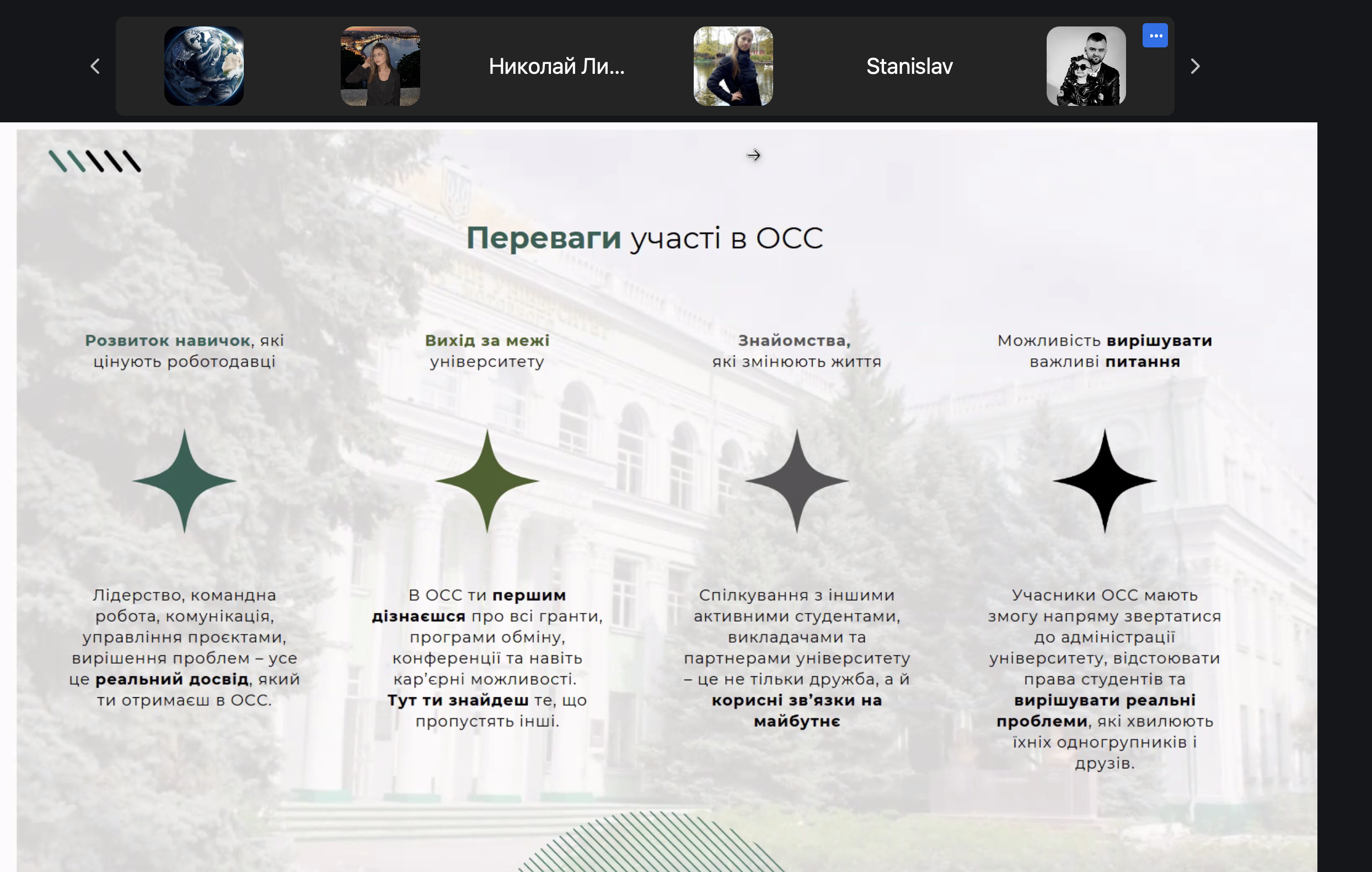 Здобувачі-маркетологи отримали можливість ознайомитися з перевагами, які дає активна участь у студентському самоврядуванні: розвиток навичок лідерства, розширення зв’язків, вирішення важливих питань і можливість виходу за межі університету.