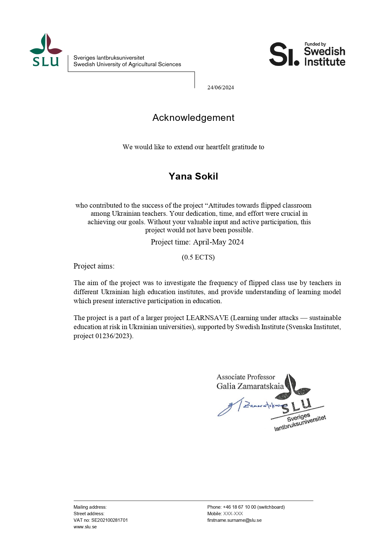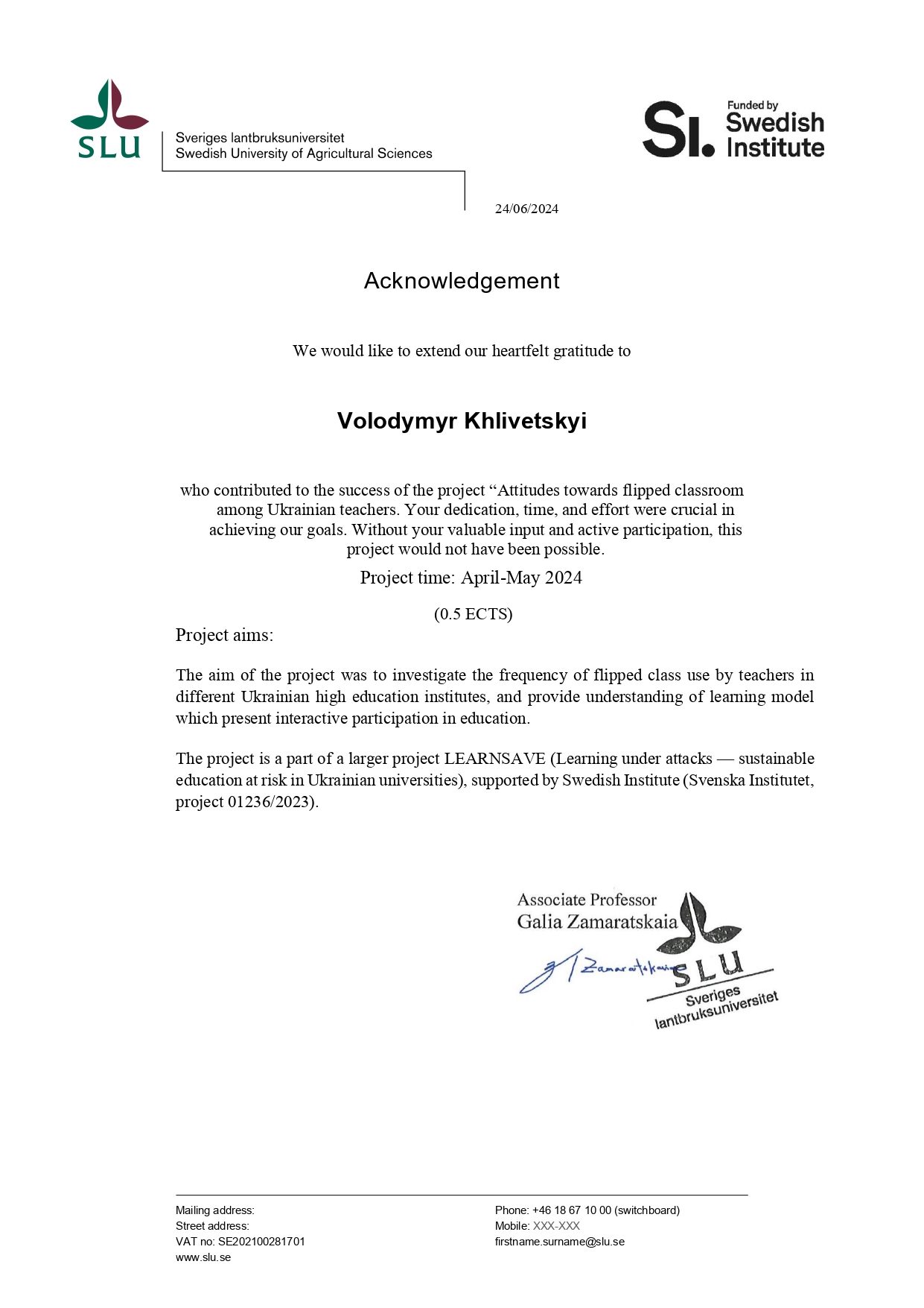 Викладачі, магістри та аспіранти кафедри маркетингу ТДАТУ успішно завершили навчання у межах проєкту “Attitudes towards flipped classroom among Ukrainian teachers”. Ця програма була реалізована за підтримки Шведського Інституту (Svenska Institutet) у межах ширшого проєкту LEARNSAVE (Learning under attacks — sustainable education at risk in Ukrainian universities) і тривала з квітня до травня 2024 року. За результатами навчання учасники отримали офіційні сертифікати, що підтверджують їхню участь та засвоєні знання, а також академічні кредити (0,5 ECTS).
