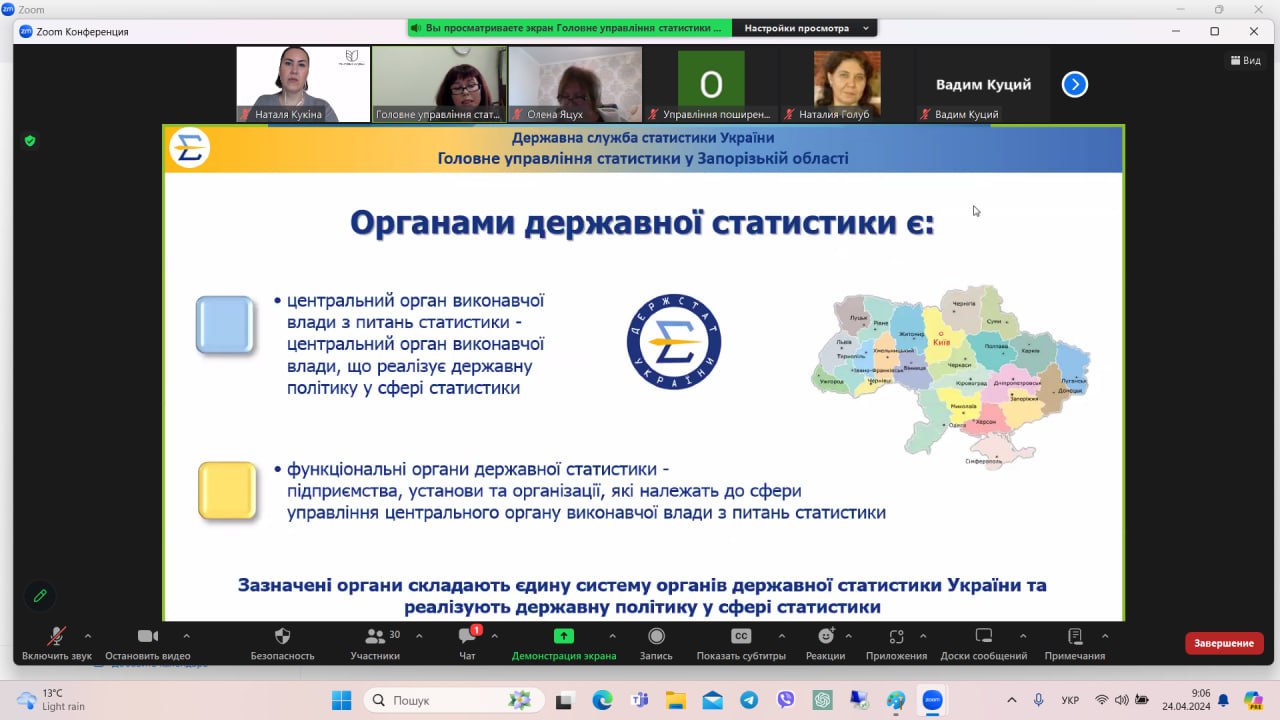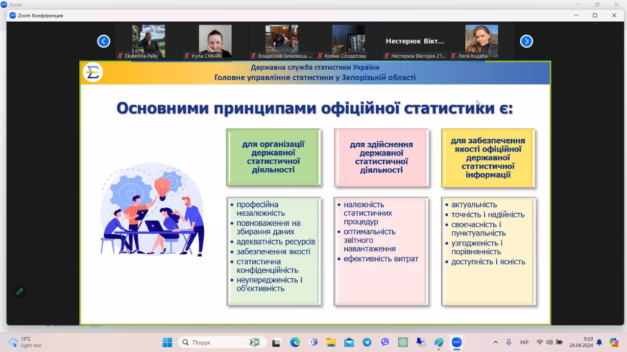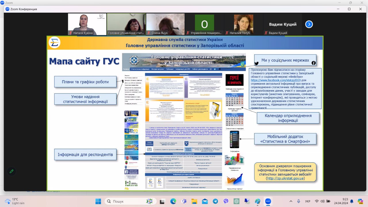 Оскільки економічні спеціальності тісно пов’язані зі збором, обробкою та аналізом економічної, соціальної та демографічної статистичної інформації, кафедра маркетингу для здобувачів вищої освіти організувала онлайн-семінар з представниками органів статистики з метою висвітлення умов користування статистичної інформацією, можливості використання мобільного додатку, знайомства з вебсайтами Державної служби статистики та Головного управління статистики у Запорізькій області, роз’яснення правил оформлення запиту на публічну інформацію тощо.
