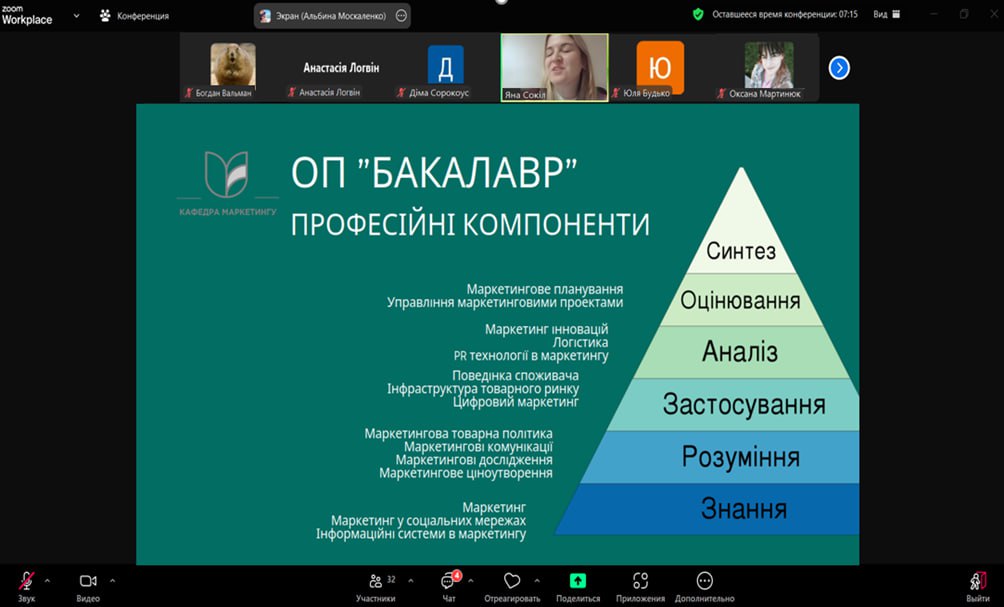 Гарант ОПП першого (бакалаврського) рівня освіти – к.е.н., доцент Яна СОКІЛ зосередила увагу першокурсників на головних аспектах професійної програми. Бакалаврська програма спрямована на надання здобувачам вищої освіти фундаментальних знань у сфері маркетингу, маркетингових комунікацій та сучасних цифрових інструментів. Вона охоплює основи маркетингового дослідження, планування та управління маркетинговими проєктами, що дозволяє випускникам адаптуватися до різних сфер професійної діяльності. Гарант бакалаврської програми наголосив, що підготовка здобувачів освіти включає не лише теоретичне навчання, а й практичні заняття, кейс-стаді та співпрацю з підприємствами, що дозволяє здобувачам вищої освіти закріпити знання в реальних умовах бізнесу.