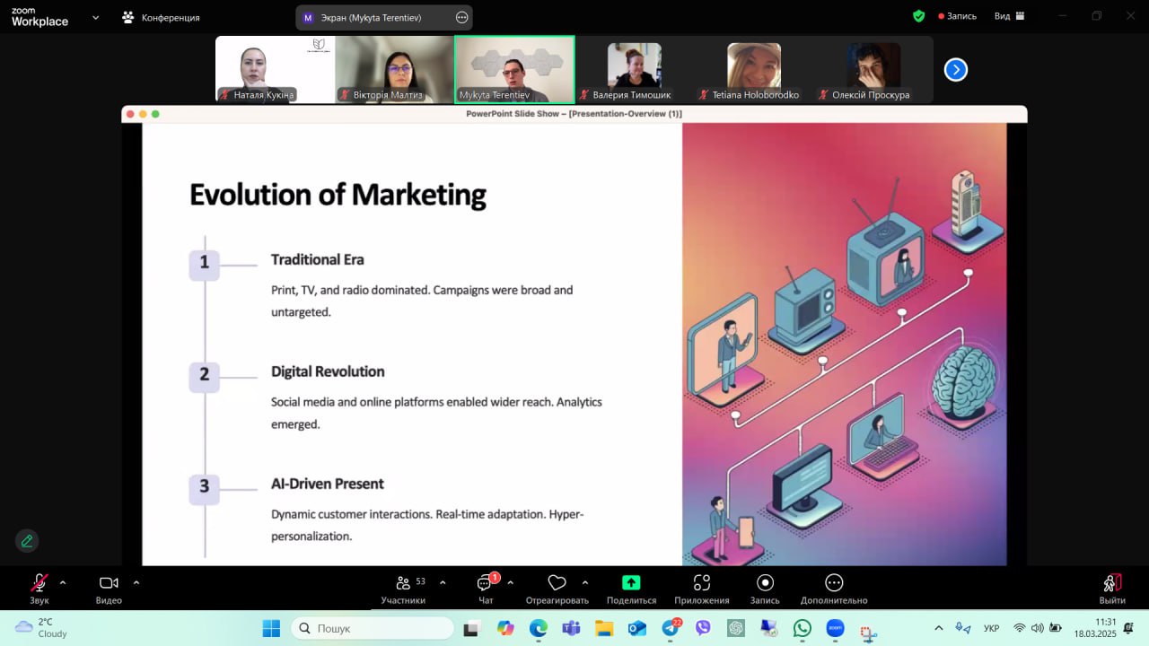 Окремий блок лекції було присвячено еволюції маркетингу. Спікер пояснив, як відбувався перехід від традиційної ери, коли маркетингові кампанії базувалися на друкованих ЗМІ, телебаченні та радіо й не мали високого рівня персоналізації, до цифрової революції, коли з появою соціальних мереж та онлайн-платформ бізнеси отримали можливість значно розширити свою аудиторію та покращити аналітику. Сучасний маркетинг, керований штучним інтелектом, дозволяє динамічно взаємодіяти з клієнтами, адаптувати рекламні стратегії в режимі реального часу та створювати унікальні персоналізовані пропозиції для кожного споживача.