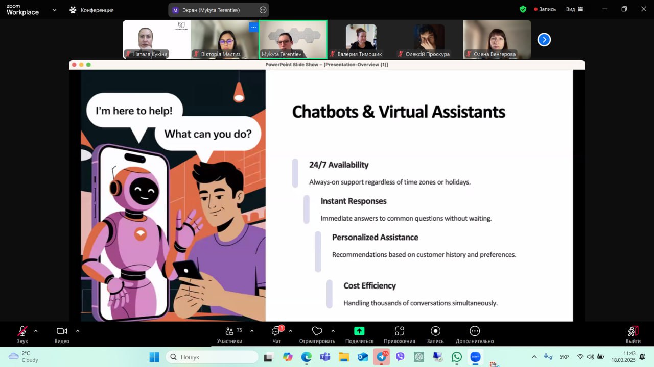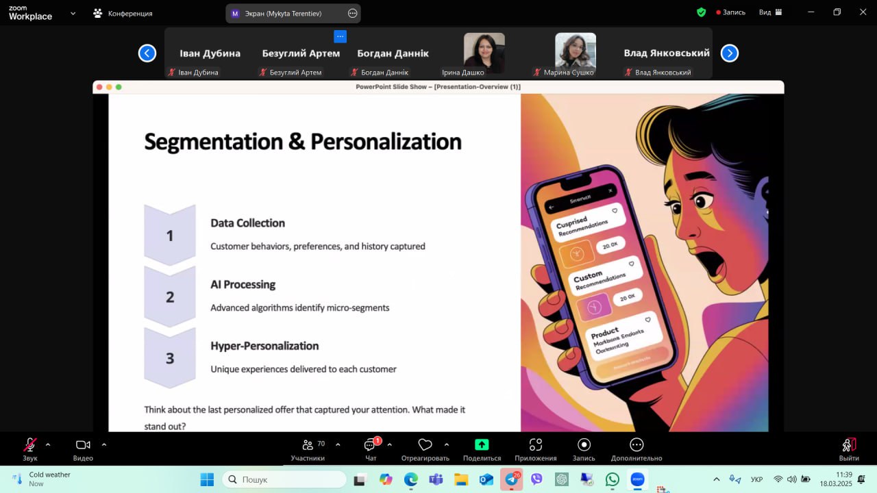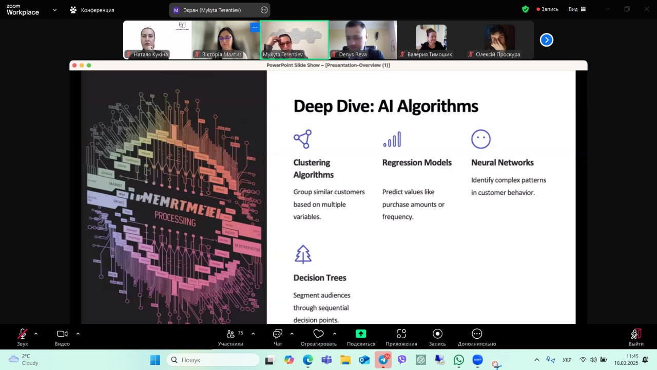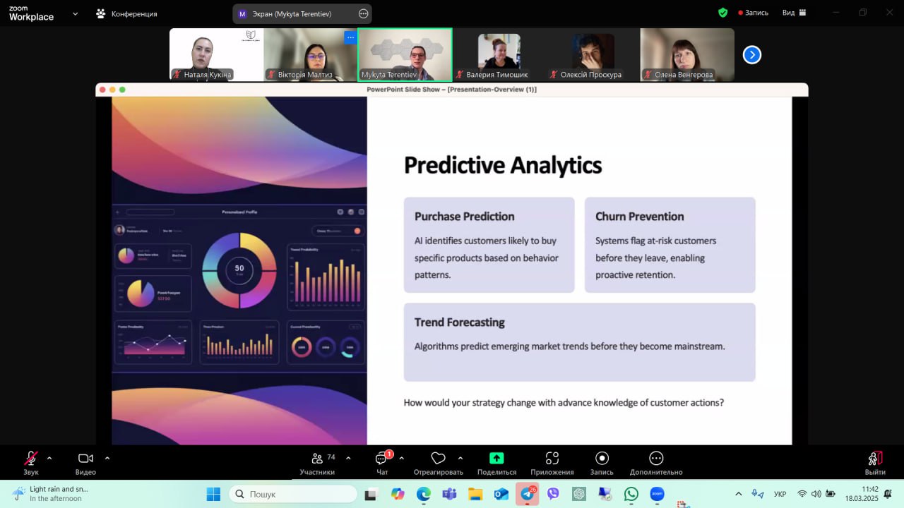 Під час лекції було висвітлено кілька ключових аспектів використання ШІ у маркетингових процесах. Спікер наголосив, що штучний інтелект докорінно змінює всі аспекти маркетингу, від сегментації аудиторії до обслуговування клієнтів. Завдяки автоматизації та аналізу даних компанії можуть значно підвищити ефективність своїх маркетингових кампаній. Найуспішніші стратегії тепер базуються на аналітиці та прогнозах, створених за допомогою ШІ, що дозволяє бізнесу швидше реагувати на зміни в ринку та адаптувати свої стратегії. Окрему увагу було приділено етичним аспектам використання штучного інтелекту, адже важливо забезпечити відповідальне використання технологій, уникати дискримінації та дотримуватися конфіденційності даних. Спікер наголосив, що непрозорість алгоритмів може викликати проблеми, а також підкреслив необхідність дотримання нормативних вимог у сфері ШІ. Майбутнє маркетингу передбачає ще більш персоналізований і інтерактивний підхід, а маркетингові рішення ставатимуть ще більш інтуїтивними завдяки використанню передових аналітичних методів і генеративного ШІ.