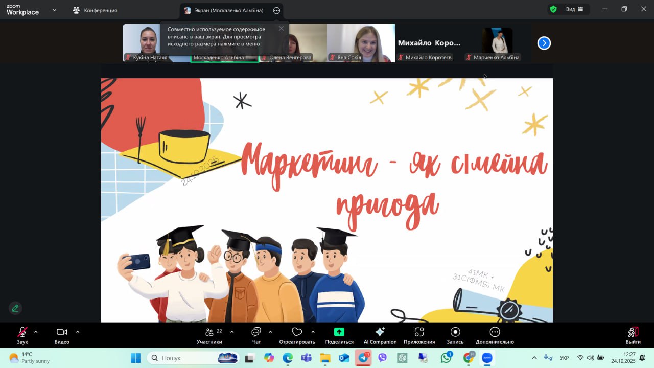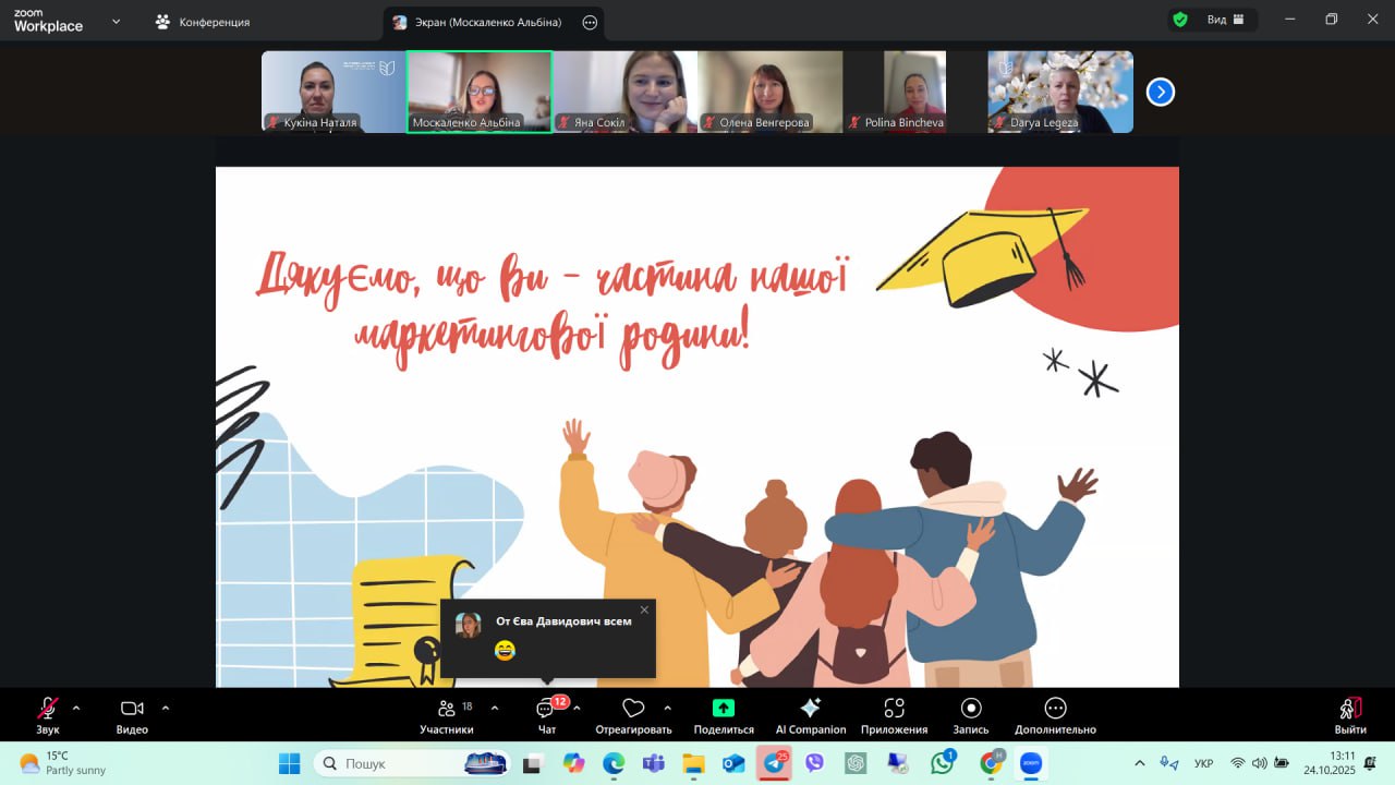 До Дня маркетолога здобувачі 4 курсу спеціальності «Маркетинг» організували яскраве онлайн-свято для всієї кафедри маркетингу. У теплій, дружній атмосфері здобувачі та викладачі провели спільний захід, який перетворився на справжню сімейну подію під гаслом «Маркетинг – як сімейна пригода».