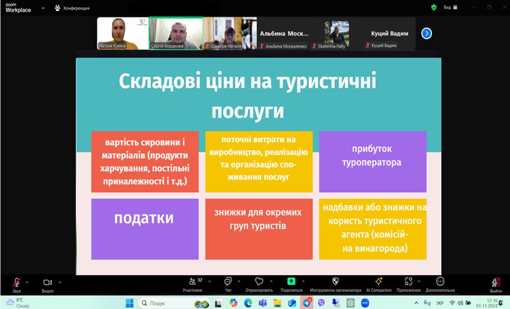 • 01.11.24 о 10:45 Маркетинг у туризмі – лектор Бордюжа С.О. в рамках теми дисертаційного дослідження «Маркетингові стратегії інноваційного розвитку підприємств ринку туристичних послуг» та робочої програми дисципліни «Маркетинг послуг»: особливості просування туристичних послуг, сучасні тренди та поведінкові моделі споживачів у цій галузі.