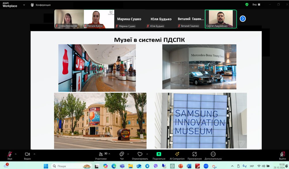 • 28.10.24 о 14:45 Організація виставок та ярмарків – лектор Лавріненко С.І. в рамках теми дисертаційного дослідження «Маркетинг територій як фактор соціально-економічного розвитку регіону» та робочої програми дисципліни «Маркетингові комунікації»: практичні аспекти планування та проведення маркетингових заходів, ефективні способи залучення партнерів і клієнтів;