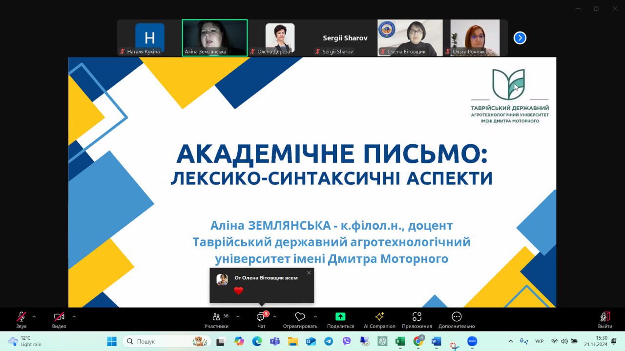 21 листопада 2024 року викладачі кафедри маркетингу Таврійського державного агротехнологічного університету імені Дмитра Моторного взяли участь в онлайн-практикумі «Академічне письмо та доброчесність», організованому в межах освітньої програми підвищення кваліфікації «Сучасна українська мова в побутовій та професійній комунікації».