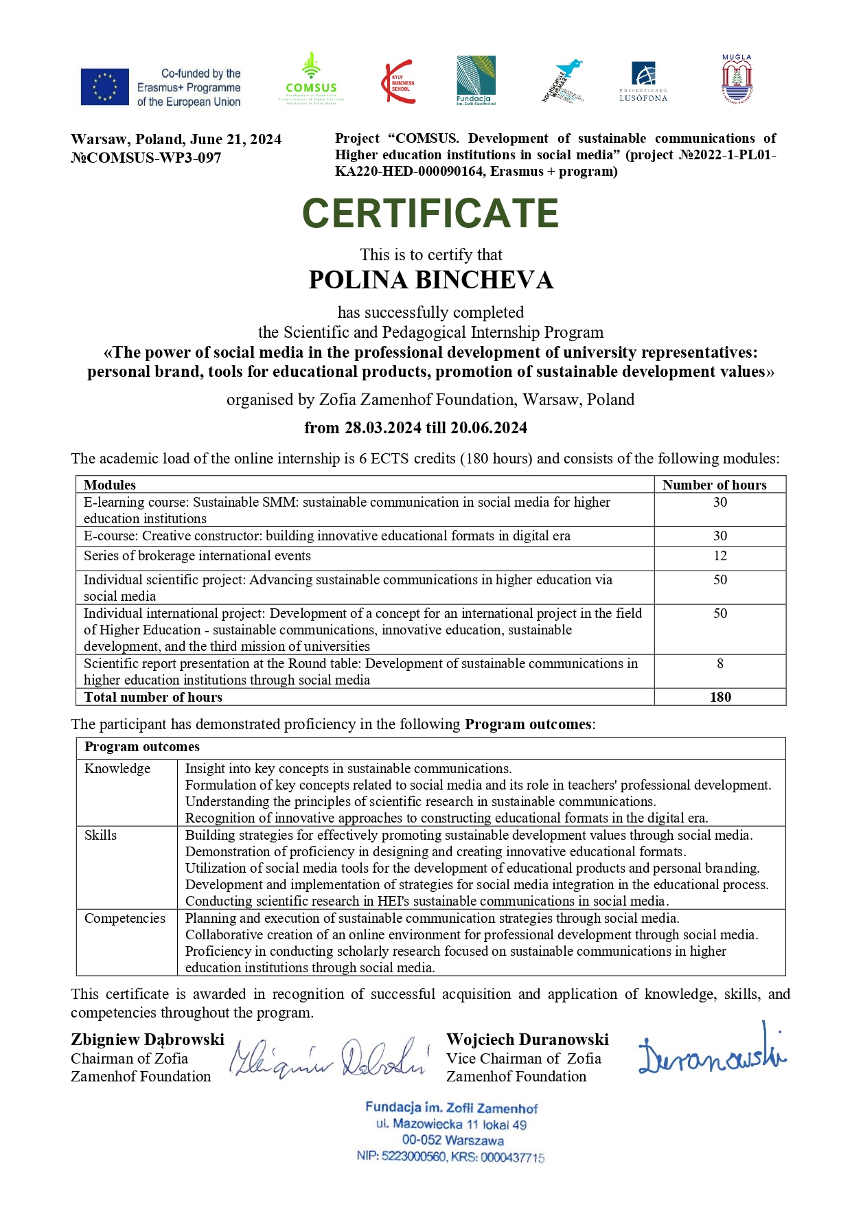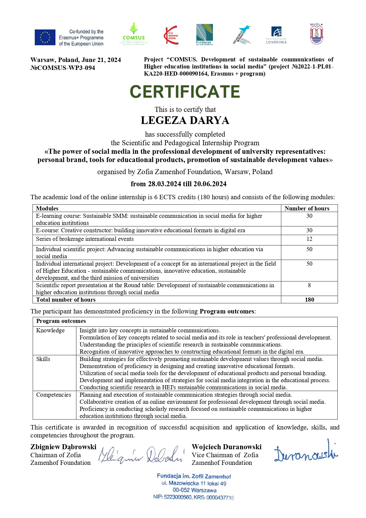 Викладачі кафедри успішно завершили міжнародне стажування в Польщі в рамках науково-педагогічної програми, організованої Zofia Zamenhof Foundation у Варшаві. Стажування тривало з 28 березня до 20 червня 2024 року та охоплювало 180 годин академічного навантаження, що відповідає 6 ECTS кредитам.