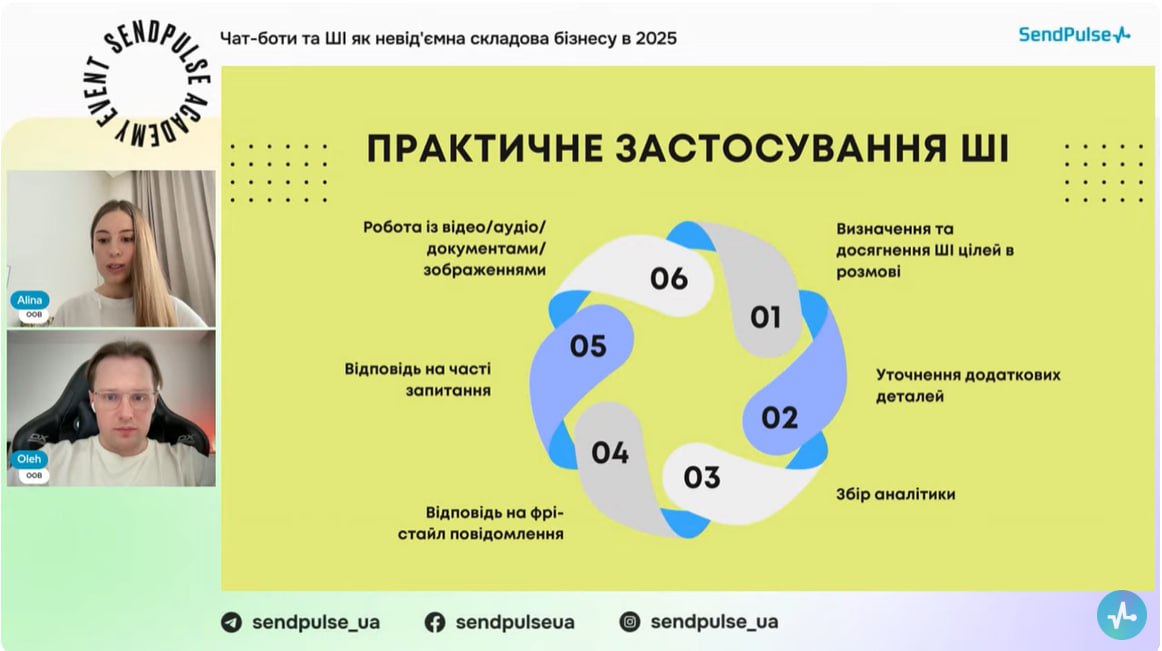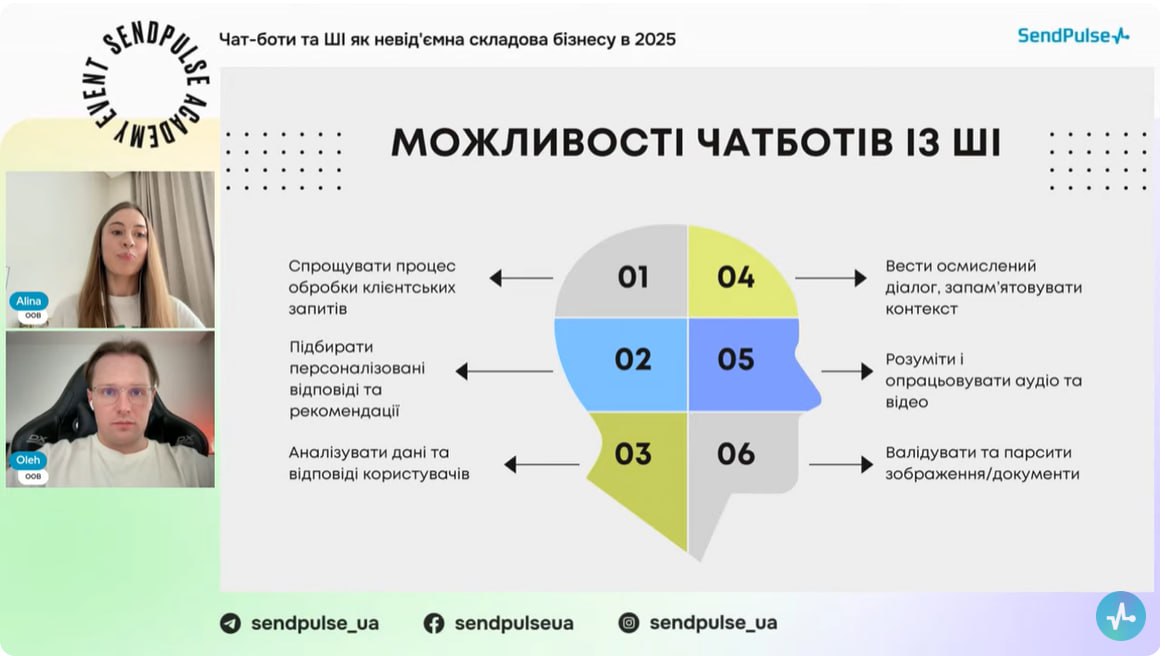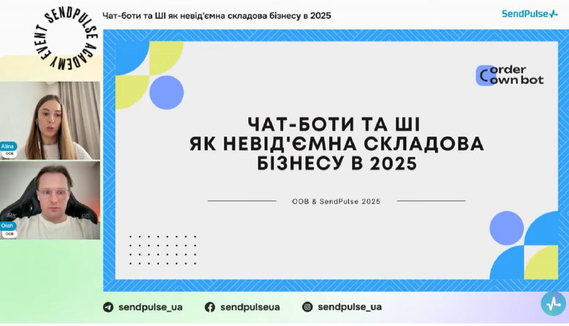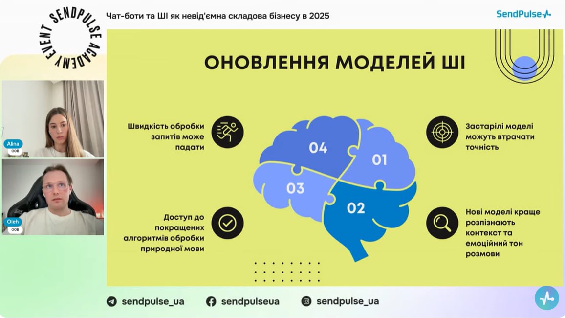 20 березня викладачі та здобувачі кафедри маркетингу ТДАТУ долучилися до вебінару «Чат-боти та ШІ як невід’ємна складова бізнесу в 2025». Захід, організований компанією SendPulse, був присвячений розгляду ключових аспектів використання чат-ботів та штучного інтелекту у сучасному бізнесі.