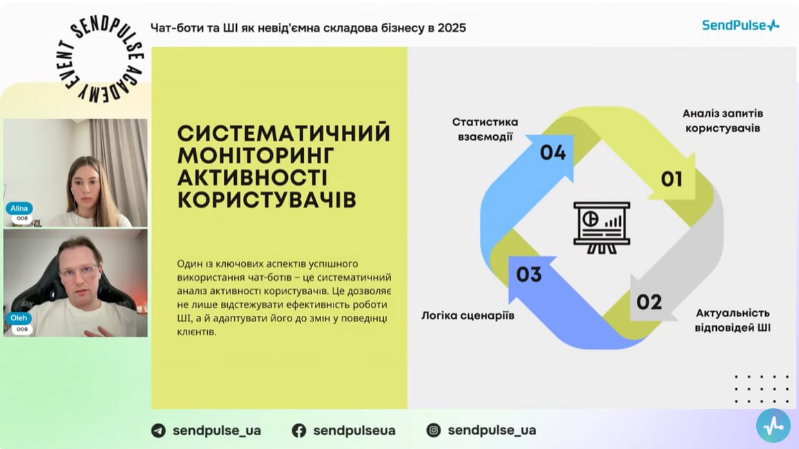 Однією з головних тез вебінару стало усвідомлення того, що налаштування чат-бота – це лише перший крок. Його ефективність залежить від регулярного оновлення та адаптації до змін у бізнес-середовищі. Спікери Аліна Боярчук (Automation Engineer, OOB) та Олег Фукс (Software Engineer, OOB) наголосили, що чат-бот не може бути системою «налаштував і забув», адже потребує постійного аналізу діалогів, оновлення контенту та налаштування алгоритмів для покращення взаємодії з користувачами.
