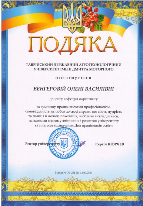 До Дня працівників освіти викладачі кафедри маркетингу Таврійського державного агротехнологічного університету імені Дмитра Моторного отримали почесні відзнаки за сумлінну працю, професіоналізм та вагомий внесок у розвиток університету.