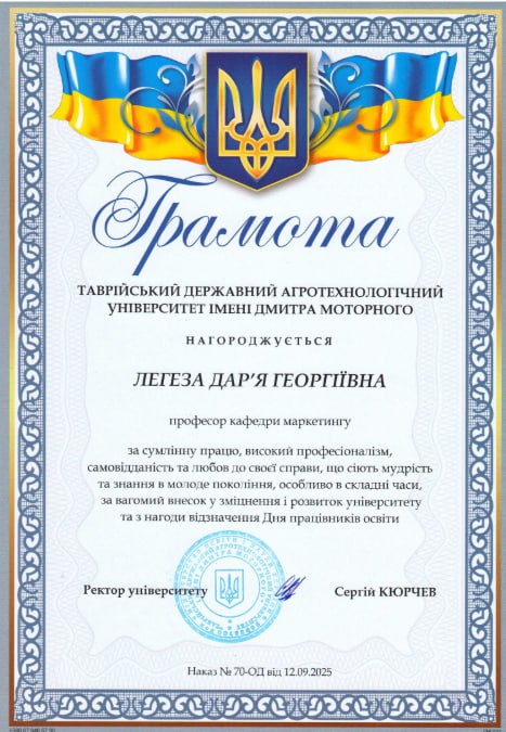 Професора кафедри маркетингу Легезу Дар’ю Георгіївну нагороджено Грамотою університету за високий професіоналізм, самовідданість, любов до своєї справи та вагомий внесок у підготовку молодих фахівців.