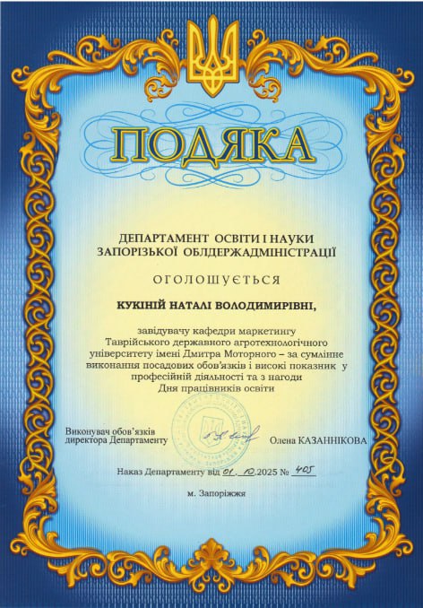 Подяку Департаменту освіти і науки Запорізької обласної державної адміністрації отримала завідувачка кафедри маркетингу Кукіна Наталя Володимирівна за сумлінне виконання посадових обов’язків і високі досягнення у професійній діяльності.