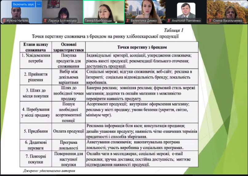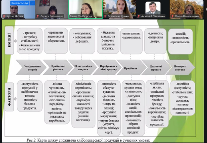 Окрему увагу в доповіді було приділено карті шляху споживача хлібопекарської продукції, яка відображає емоційні чинники та раціональні критерії прийняття рішення на різних етапах купівельного процесу. На основі представлених схем і таблиць було продемонстровано ключові точки перетину споживача з брендом, що формують лояльність та повторні покупки в сучасних умовах ринку.
