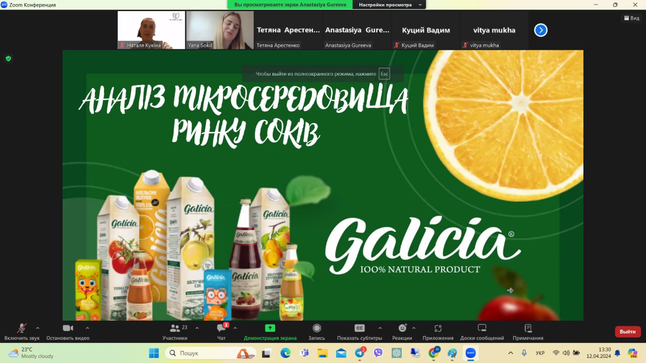 | Гурєєва Анастасія, здобувачка вищої освіти спеціальності 075 «Маркетинг», 21 МК групи | Назва доповіді: Аналіз мікросередовища підприємства на ринку соків в Україні | Науковий керівник: к.е.н., доцент, доцент кафедри маркетингу Сокіл Я.С. |