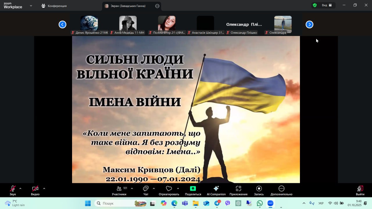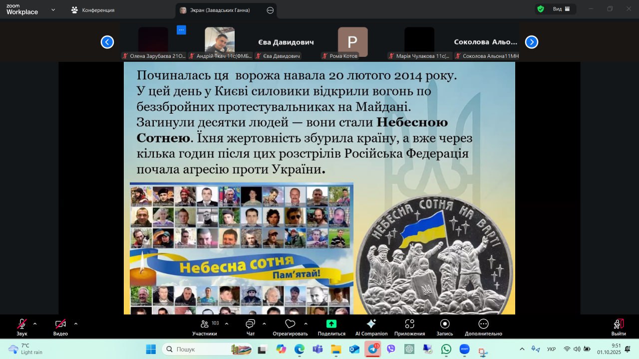 1 жовтня 2025 року здобувачі кафедри маркетингу взяли участь у кураторській годині, присвяченій Дню захисника та захисниць України. Захід став нагодою вшанувати пам’ять тих, хто віддав своє життя за свободу та незалежність держави, а також висловити подяку сучасним воїнам, які сьогодні стоять на передовій.
