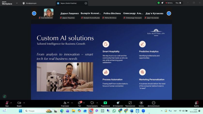 Під час зустрічі спікерка представила реальний кейс п’ятизіркового готельного бізнесу Балтійського регіону та поділилася практичним досвідом впровадження штучного інтелекту в управління, маркетинг і клієнтський сервіс у туристичній сфері. Особливу увагу було приділено таким питанням, як персоналізація маркетингових комунікацій, автоматизація процесів, прогнозна аналітика попиту та використання AI-рішень для підвищення ефективності бізнесу.