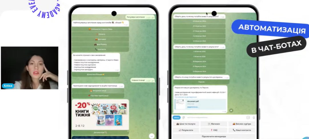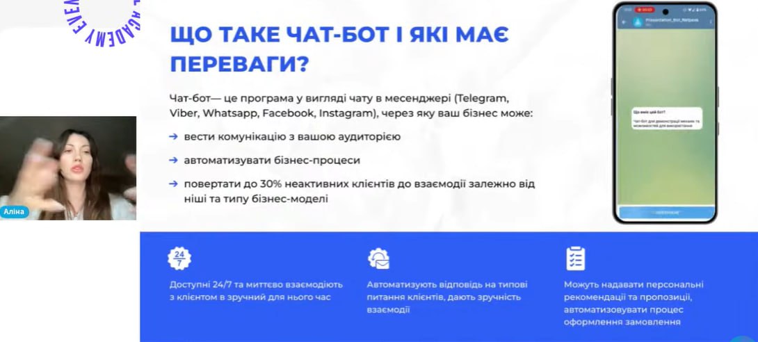 На практичних прикладах було продемонстровано, чому чат-боти стають обов’язковим елементом маркетингових і сервісних стратегій у 2026 році, які головні тренди визначатимуть їх подальший розвиток, а також як використання інтелектуальних ботів впливатиме на ефективність бізнес-процесів, маркетингу та підтримки клієнтів. Учасники семінару також обговорили, які кроки доцільно здійснювати бізнесам уже сьогодні, щоб бути готовими до майбутніх змін у сфері автоматизованих комунікацій.