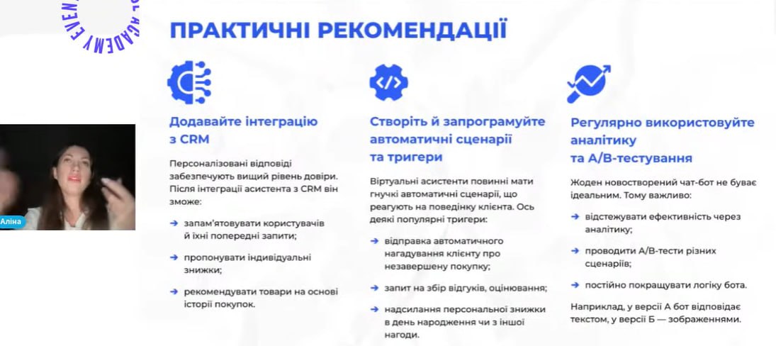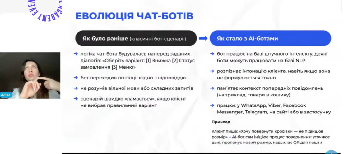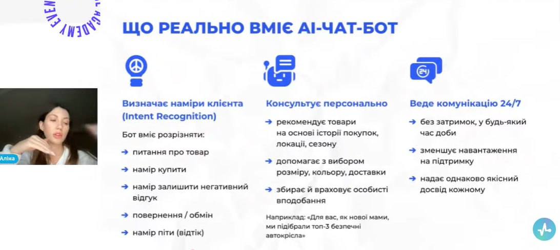 У межах семінару розглядалися питання еволюції чат-ботів від простих скриптових рішень до повноцінних AI-агентів, здатних навчатися, адаптуватися до поведінки користувачів та забезпечувати високий рівень персоналізації взаємодії. Окрему увагу було приділено розвитку штучного інтелекту, впровадженню голосових інтерфейсів і переходу до мультиканальної комунікації, що дозволяє бізнесу взаємодіяти з клієнтами через різні цифрові платформи в єдиному середовищі.