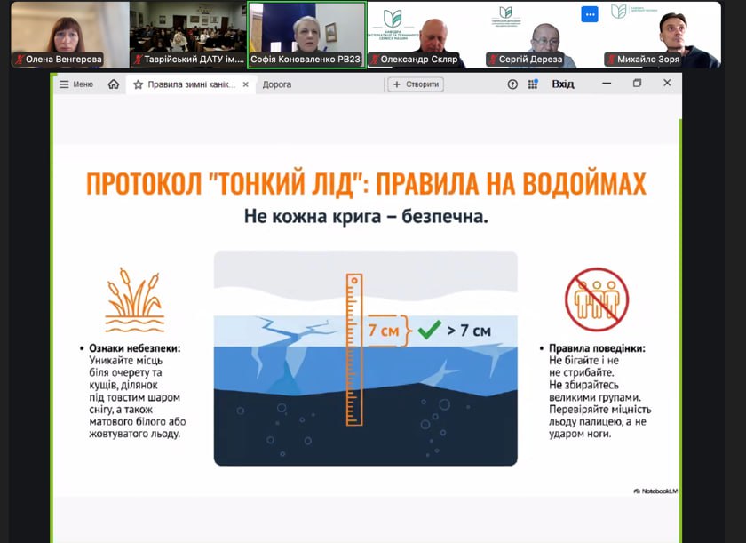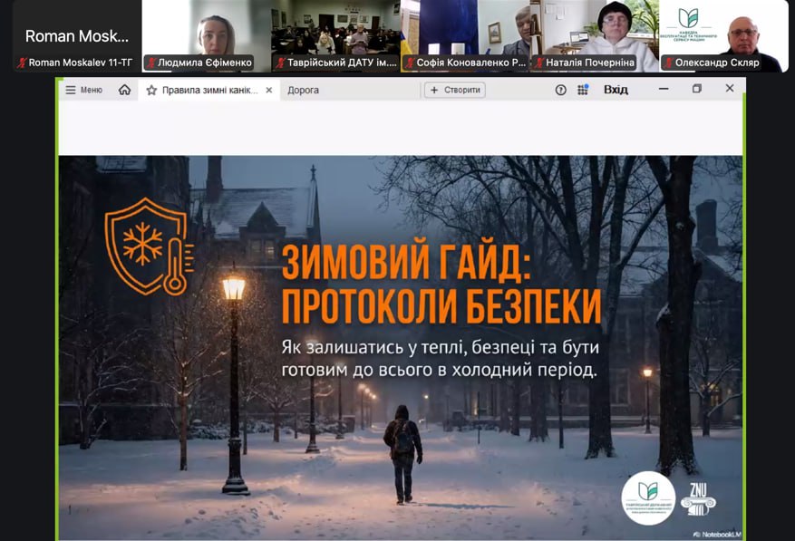 17 грудня 2025 року для здобувачів освіти було проведено вебінар, присвячений правилам безпечної поведінки в зимовий період. Захід відбувся у змішаному форматі: частина здобувачів була присутня офлайн у Таврійському державному агротехнологічному університеті імені Дмитра Моторного в місті Запоріжжя, інші доєдналися онлайн через платформу Zoom.