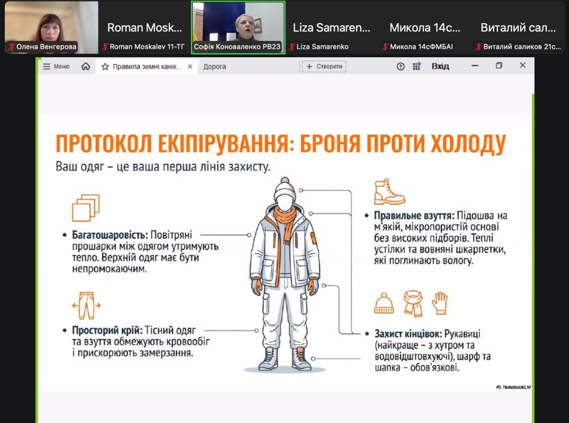 Проведення вебінару у змішаному форматі дало змогу залучити широку аудиторію здобувачів і поєднати живу взаємодію з дистанційною участю. Захід мав чітко виражений практичний характер і був спрямований на формування відповідальної та свідомої поведінки в умовах підвищених ризиків зимового періоду.