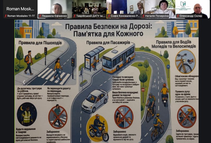 Окремий блок вебінару був присвячений безпеці на дорозі в умовах зимової погоди. Розглядалися правила безпечної поведінки пішоходів, типові ризики на проїжджій частині, небезпечні зони та дії, яких слід уникати під час переходу дороги в умовах обмеженої видимості та ожеледиці.