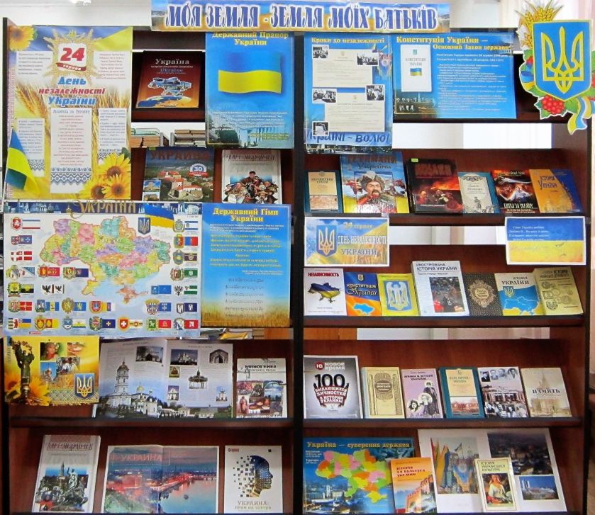 До 27-ї річниці проголошення незалежності України та до Дня державного прапора наукова бібліотека підготувала тематичну виставку-інсталяцію «Моя земля – земля моїх батьків». На виставці представленні видання, які відображають історичний шлях до незалежності держави та сьогодення.