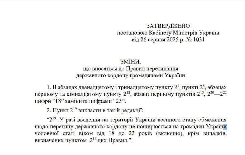 Уряд України оновив порядок перетину державного кордону для громадян України чоловічої статі у віці від 18 до 22 років включно. За оновленими правилами громадяни цієї категорії мають право виїжджати за кордон під час дії воєнного стану.