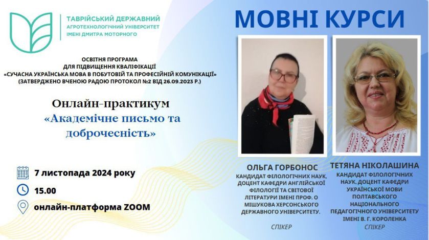 07 листопада відбулася друга серія мовних курсів для педагогічних працівників відокремлених структурних підрозділів ТДАТУ за освітньою програмою підвищення кваліфікації для педагогічних і науково-педагогічних працівників «Сучасна українська мова в побутовій та професійній комунікації». Були проведені онлайн-практикуми за модулем «Академічне письмо та доброчесність».