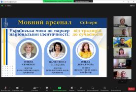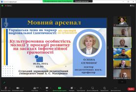Спікеркою першого дня Мовного арсеналу виступила Олена Семеног – д.пед.н., професор, завідувач кафедри української мови і літератури Сумського державного педагогічного університету імені А.С. Макаренка – із презентаційним виступом «Культуромовна особистість молоді у проєкції розвитку на засадах інфомедійної грамотності». У своїй доповіді спікерка торкнулась таких важливих сучасного функціонування української мови, як роль у національній самоідентифікації, інфомедійна грамотність, лінгвоцид та засоби його подолання. Разом із Наталією Пономаренко, д-ром філософії, асистентом кафедри журналістики та філології Сумського державного університету, медіатренеркою спікерка розвінчувала найвідоміші фейки, пов’язані з мовним питанням, а також презентувала відео-, аудіо- та друковані проєкти здобувачів освітніх закладів різного рівня у м. Суми та в регіоні: «Відомі невідомі Суми», «Мовний форпост Сумщини» та ін.