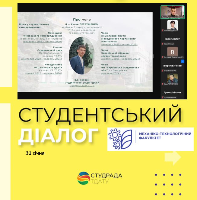 Під час діалогу студенти ознайомилися із системою студентського самоврядування ТДАТУ, можливістю долучення до команди ради факультету МТ та Студентської ради ТДАТУ. Обговорили виклики, що стоять перед студентською спільнотою.