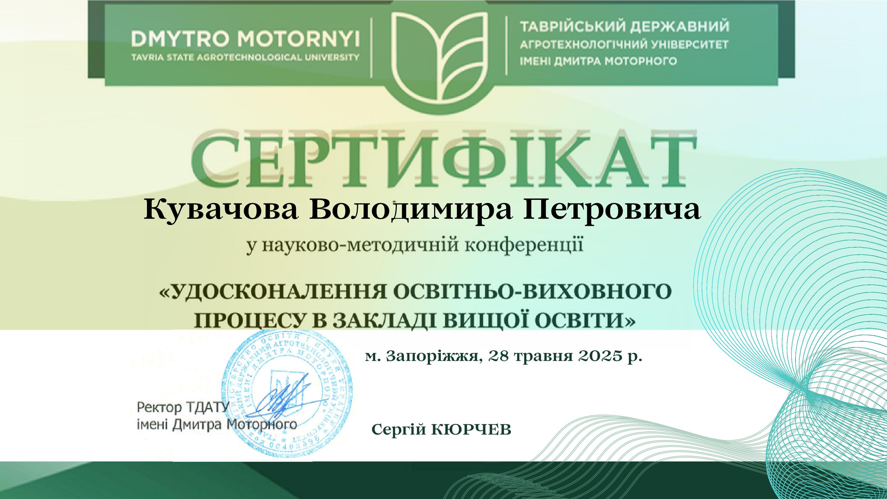 28 травня 2025 року в рамках науково-методичної конференції «Удосконалення освітньо-виховного процесу в закладі вищої освіти» Таврійського державного агротехнологічного університету імені Дмитра Моторного відбулося пленарне засідання, на якому з доповіддю виступив доктор технічних наук, професор, декан механіко-технологічного факультету ТДАТУ Володимир Кувачов.