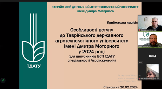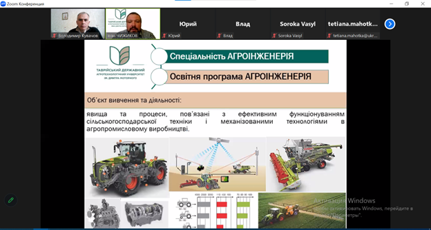 29 лютого відбулася профорієнтаційна зустріч декана, проф. КУВАЧОВА В.П., та представників механіко-технологічного факультету з випускниками спеціальності 208 «Агроінженерія» ВСП «Оріхівський фаховий коледж ТДАТУ» і ВСП «Ногайський фаховий коледж ТДАТУ». Це важлива подія для здобувачів освіти, адже незабаром вони закінчать фахові коледжі і більшість з них виявить бажання здобути освітній рівень”БАКАЛАВР” саме в Таврійському державному агротехнологічному університеті імені Дмитра Моторного. Зустріч була організована у форматі on-line.