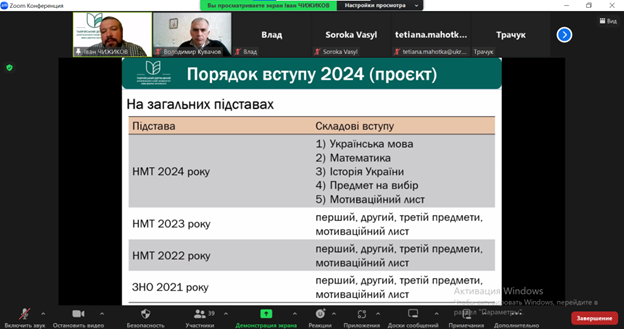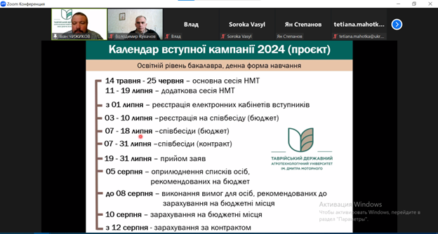 У своєму виступі декан факультету Володимир КУВАЧОВ підкреслив важливість продовження навчання випускників коледжів на освітньому рівні «БАКАЛАВР». Оскільки отриманий диплом бакалавра – це диплом про повну вищу освіту і він надає можливість працювати за спеціальністю або здобувати вищу освіту другого (магістерського) рівня, особливо зараз, в умовах воєнного стану в країні. Про проєкт Правил вступу до ТДАТУ у 2024 році на зустрічі доповів заступник декана факультету Іван ЧИЖИКОВ. Випускники коледжів отримали детальні роз’яснення, щодо особливостей національного мультипредметного тесту, можливостей підготуватися до складання цього важливого іспиту, необхідних документів для реєстрації на НМТ та для подання через електронні кабінети вступника.