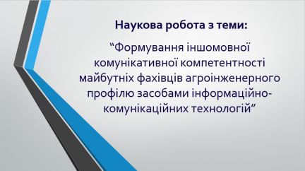 Від механіко-технологічного факультету свою роботу на тему: «Формування іншомовної комунікативної компетентності майбутніх фахівців агроінженерного профілю засобами інформаційно-комунікаційних технологій» представляв студент 31 АІ групи Олександр Курашкін. Робота, яку написав Олександр під керівництвом викладача-стажиста кафедри «Іноземні мови» Вікторії Лемещенко-Лагоди присвячена аналізу проблем іншомовної підготовки майбутніх фахівців аграрного сектору та розробці технології їх вирішення шляхом використання сучасних інформаційно-комунікаційних технологій, зокрема планшетних комп’ютерів.
