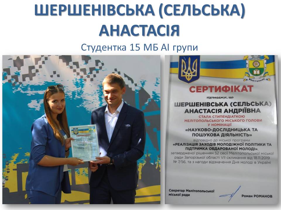 Стипендіатка Мелітопольського міського голови в номінації “Науково-дослідницька та пошукова діяльність” |