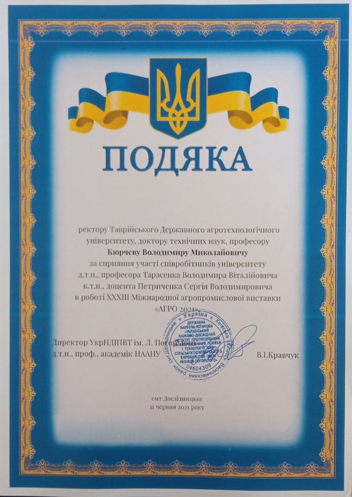 УЧАСТЬ СПІВРОБІТНИКІВ МЕХАНІКО-ТЕХНОЛОГІЧНОГО ФАКУЛЬТЕТУ В ХХХІІІ МІЖНАРОДНІЙ АГРОПРОМИСЛОВІЙ ВИСТАВЦІ «АГРО-2021».