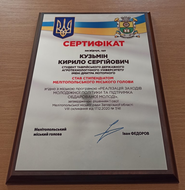 ВІТАЄМО СТУДЕНТА МЕХАНІКО-ТЕХНОЛОГІЧНОГО ФАКУЛЬТЕТУ З ОТРИМАННЯМ СТИПЕНДІЇ МЕЛІТОПОЛЬСЬКОГО МІСЬКОГО ГОЛОВИ