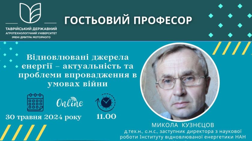 Запрошуємо 30 травня 2024 р. о 11.00 на гостьову лекцію «Відновлювані джерела енергії – актуальність та проблеми впровадження в умовах війни».