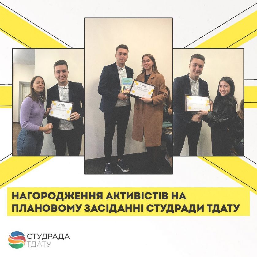 Перший місяць навчального року пройшов жваво та плідно. Тож за ініціативи голови Студради ТДАТУ, Микити Семенова, було нагороджено найактивніших представників студентського самоврядування за вагомий внесок в діяльність Студради ТДАТУ, розвиток молодіжної політики Мелітополя, високий професіоналізм та сумлінну працю. Відтепер на постійній основі діятиме система заохочення активістів.