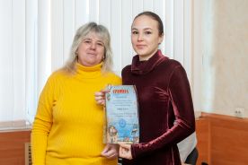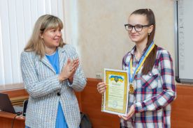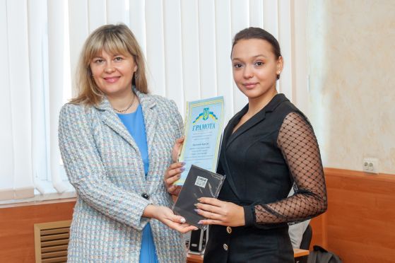 А тепер пропонуємо перейти до наших зразкових студентів, що мали честь бути нагородженими на святі. Розпочали нагородження з вручення грамоти та медалі студентці факультету, яка за підсумками минулого навчального року має найвищий академічний рейтинг. Нагороду отримала студентка групи 31-ОО Маргарита Корощенко.