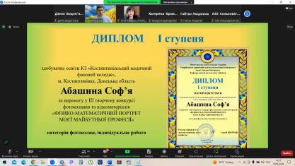 • Соф’я Абашина, здобувачка освіти КЗ «Костянтинівський медичний фаховий коледж», м. Костянтинівка, Донецька область.