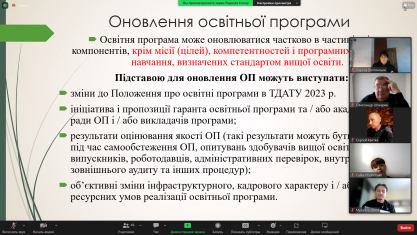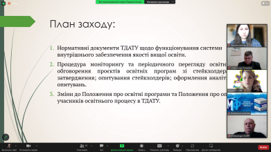 До слухачів з вступним словом звернувся перший проректор ТДАТУ, к.т.н., доцент Олександр Ломейко. Він наголосив, що освітні програми лежать в основі освітньої місії ТДАТУ, вони надають здобувачам вищої освіти знання та навички, зокрема такі, що мають широке застосування, сприяючи особистісному розвитку і їхній майбутній кар’єрі. Тому метою функціонування системи внутрішнього забезпечення якості освіти – є забезпечення і підвищення якості освіти та освітньої діяльності, її відповідності стандартам вищої освіти та міжнародним стандартам, формування в університеті культури якості як основи конкурентоспроможності університету та його випускників. Пан Олександр представив спікерку – Радмілу Скляр, к.т.н., доц., завідувачку відділу моніторингу якості освітньої діяльності.