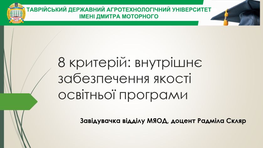 23 лютого 2023 року відбулась нарада-семінар «8 критерій: внутрішнє забезпечення якості освітньої програми» від відділу моніторингу якості освітньої діяльності ТДАТУ. На захід були запрошені декани факультетів, керівник ННІ ЗУП, завідувачі кафедр та гаранти освітніх програм, як координаторів у контексті здійснення процесів і процедур внутрішнього забезпечення якості вищої освіти.
